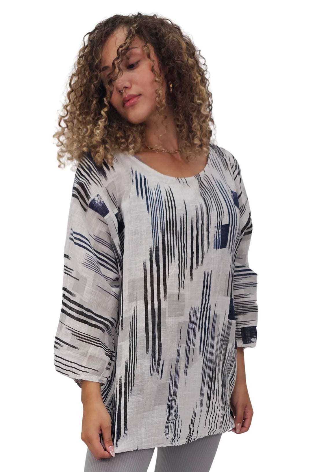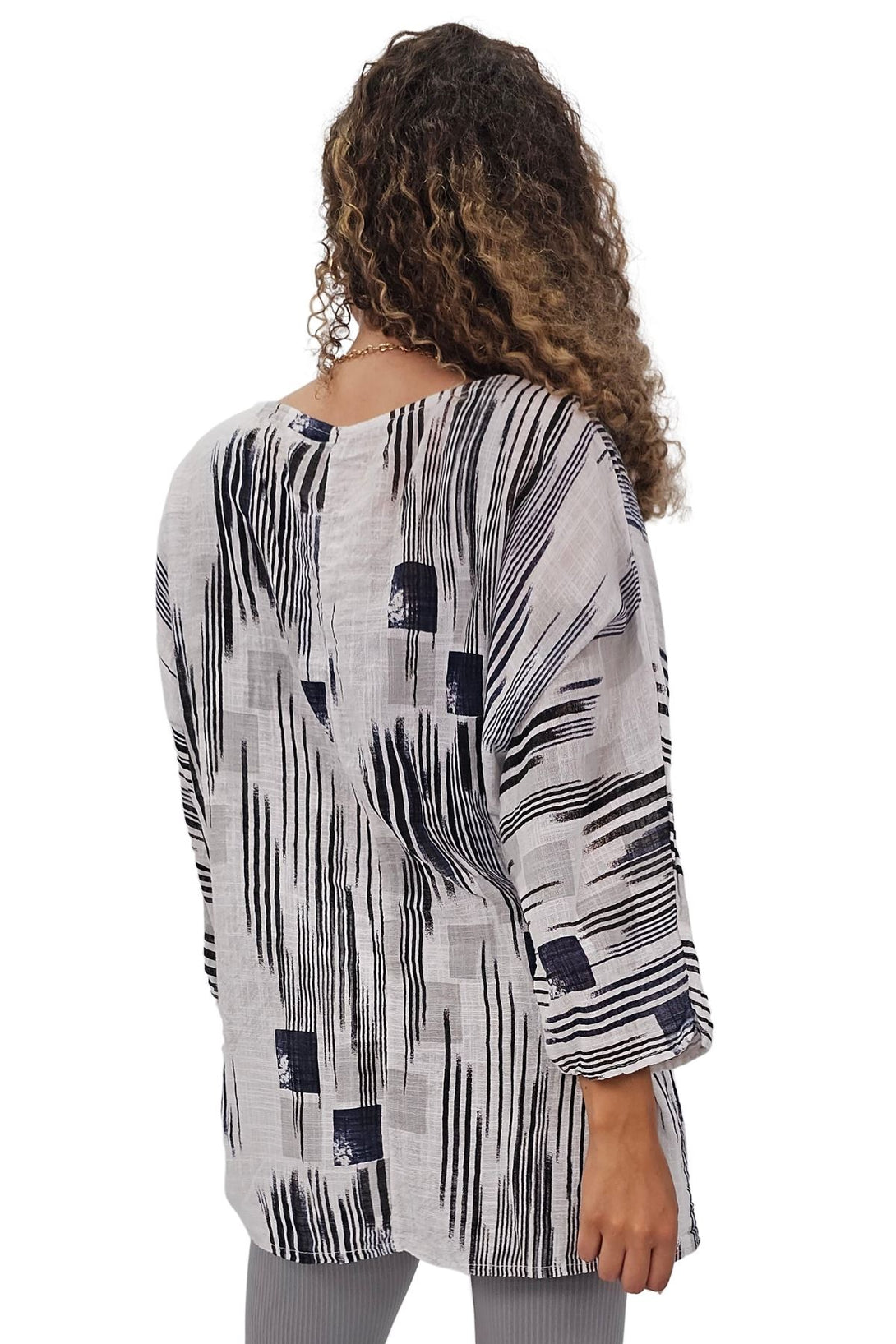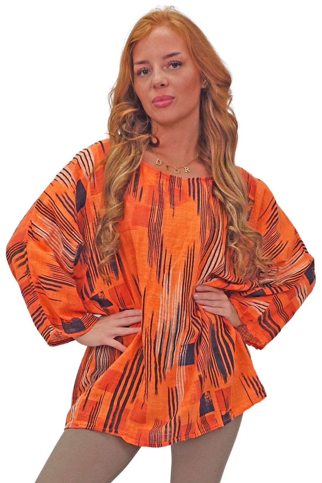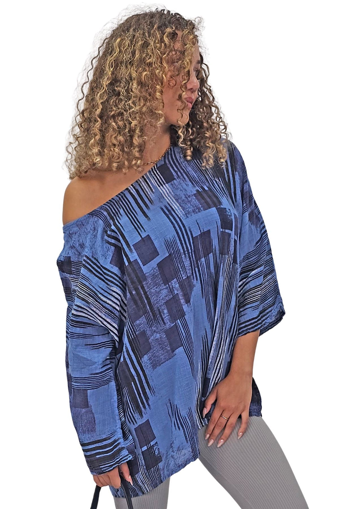This stylish tunic top combines the vibrant charm of an abstract print with the ease of a relaxed fit, perfect for the spring and summer seasons. Crafted from Italian viscose, it promises a soft, breathable feel while maintaining durability. Featuring a round neckline and 3/4 sleeves, the tunic offers a versatile look that can be dressed up or down. The oversized fit ensures comfort and freedom of movement, making it an ideal choice for casual outings or laid-back days at home. The added detail of a bold necklace accent gives this tunic a modern edge, elevating it from simple to chic. Plus-size options ensure a flattering fit for all body types. Whether paired with leggings or jeans, this tunic is a must-have addition to your seasonal wardrobe.