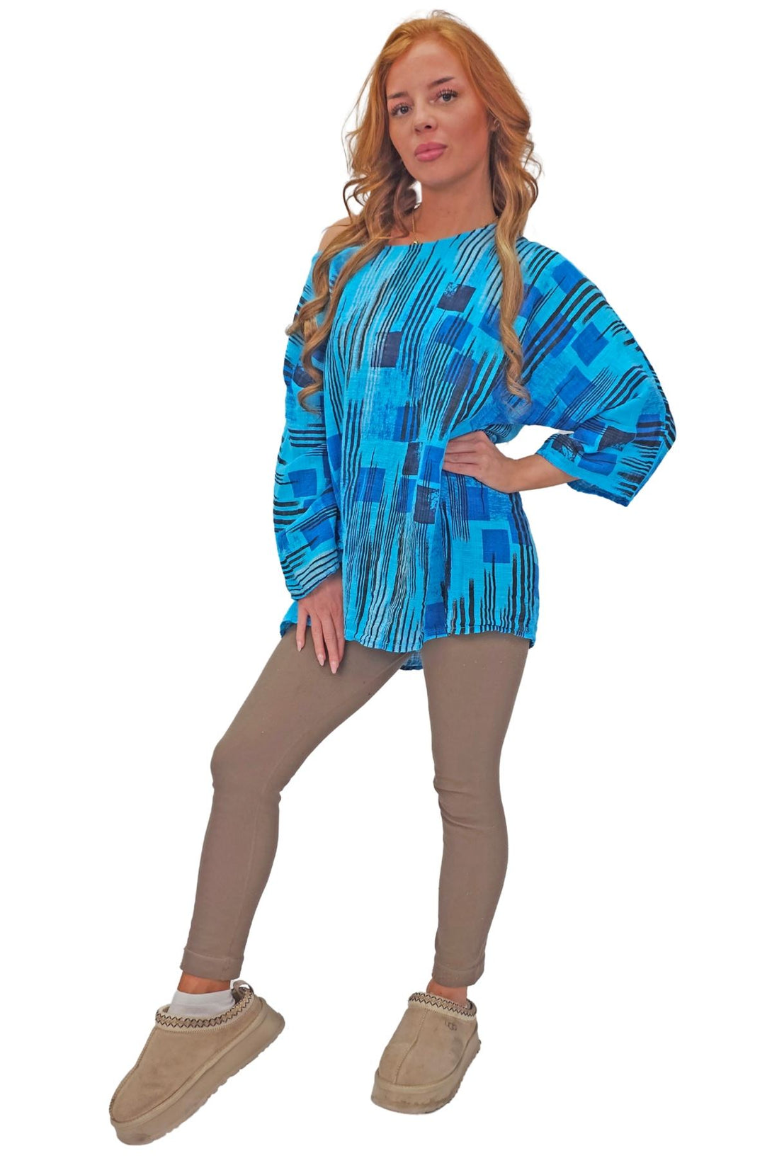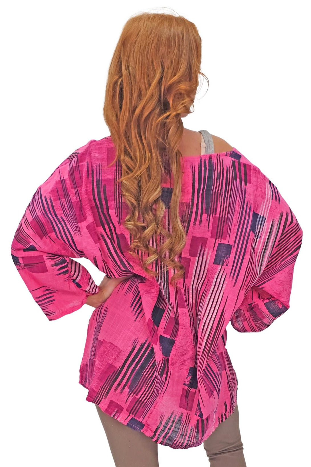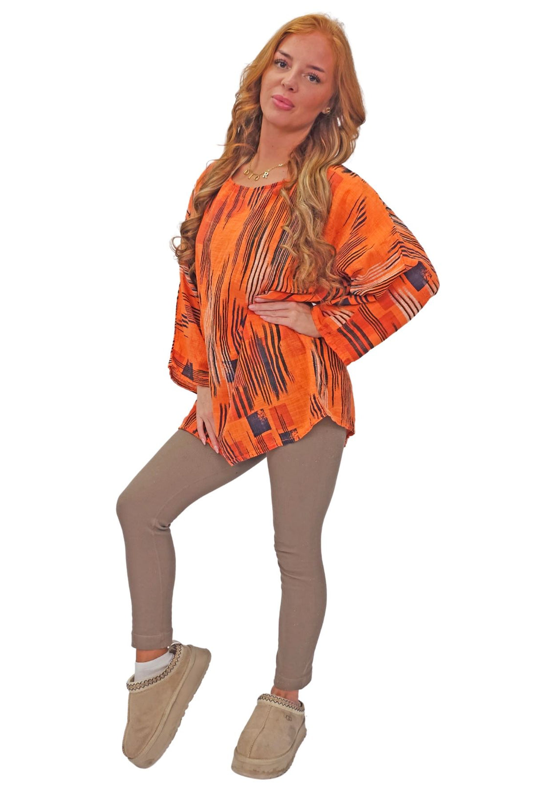 This stylish tunic top combines the vibrant charm of an abstract print with the ease of a relaxed fit, perfect for the spring and summer seasons. Crafted from Italian viscose, it promises a soft, breathable feel while maintaining durability. Featuring a round neckline and 3/4 sleeves, the tunic offers a versatile look that can be dressed up or down. The oversized fit ensures comfort and freedom of movement, making it an ideal choice for casual outings or laid-back days at home. The added detail of a bold necklace accent gives this tunic a modern edge, elevating it from simple to chic. Plus-size options ensure a flattering fit for all body types. Whether paired with leggings or jeans, this tunic is a must-have addition to your seasonal wardrobe.