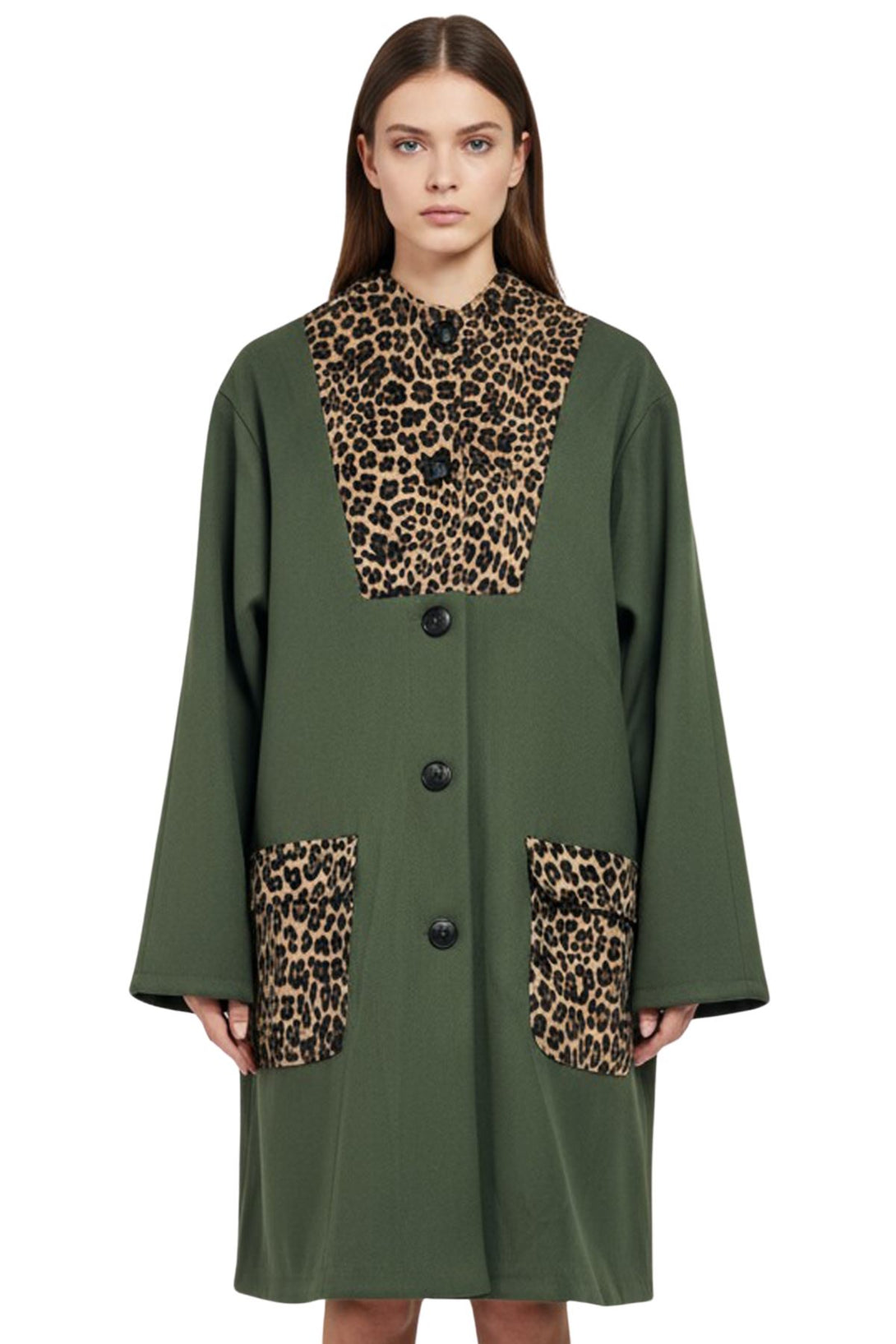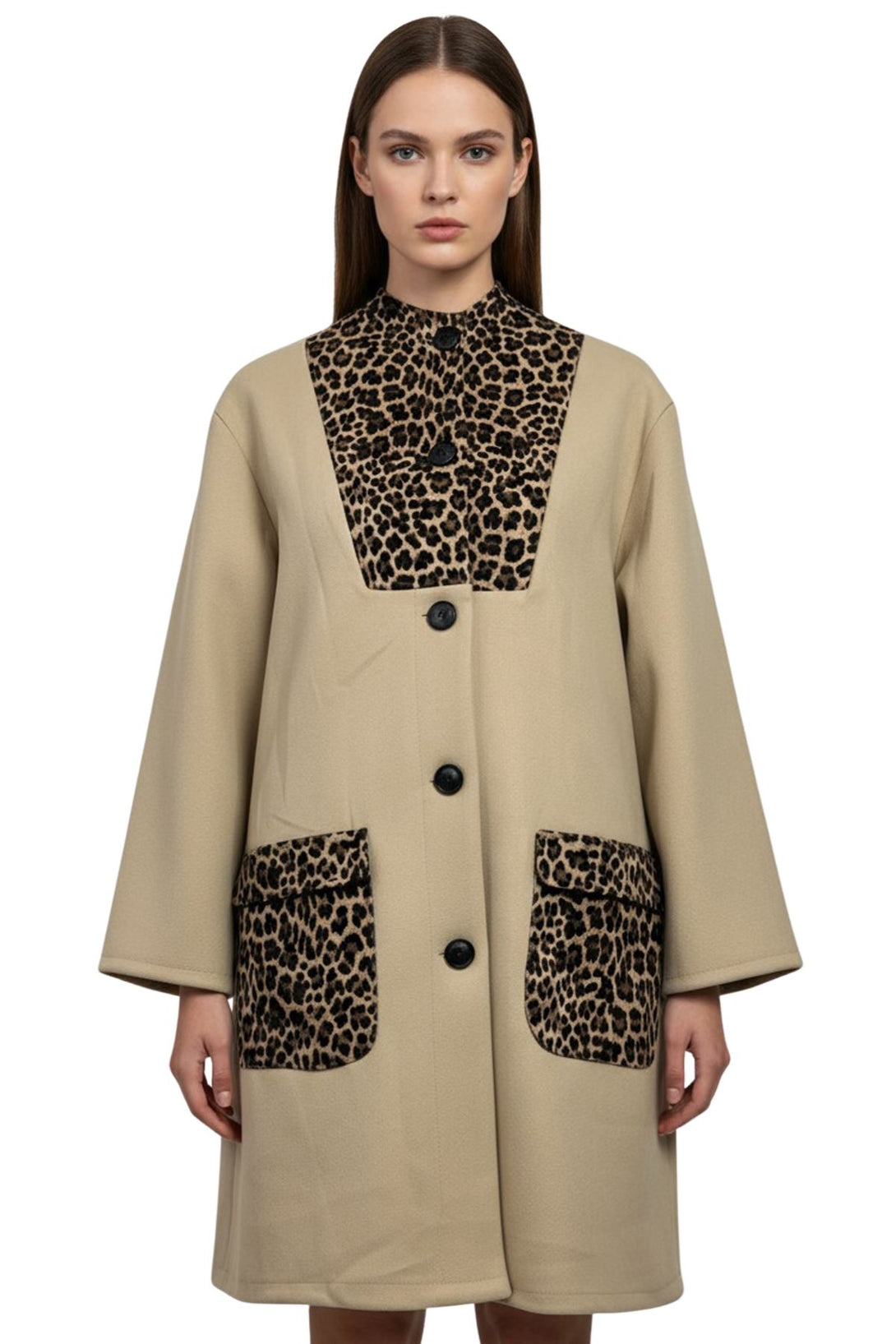 Turn chilly days into a style statement with this Italian polyester longline coat, designed to blend warmth and elegance. Its classic straight-cut silhouette and regular fit create a timeless look, while the bold leopard-print accents add a vintage-inspired glam touch. The striking leopard pattern highlights the chest panel, collar, and two front flap pockets, giving the coat a luxurious edge. Crafted from a soft, wool-blend feel fabric, it provides cozy comfort and reliable insulation for fall and winter. The button-up front ensures effortless wear, and the notched lapel frames the face beautifully, enhancing the chic design. Long sleeves and generous plus-size proportions allow easy layering over sweaters or dresses, making it both practical and stylish. Perfect for casual outings, city strolls, or evening events, this coat is a statement piece that brings confidence and sophistication to cold-weather wardrobes while keeping you comfortably warm and elegantly poised.