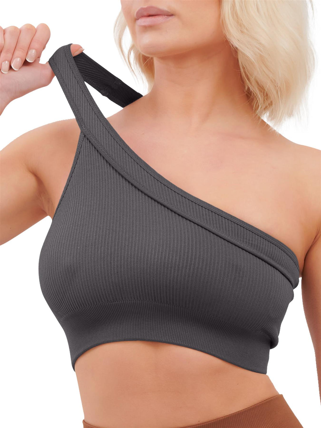 Plain One Shoulder Seamless Ribbed Nylon Bra