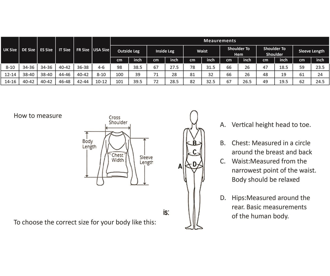 Measurements Approx:S= BOTTOM = OUTSIDE LEG -: 98CM (38") INSIDE LEG -: 67CM (27.5") WAIST -: 78CM (31.5") TOP = SHOULDER TO HEM -: 66CM (26") SHOULDER TO SHOULDER -: 46CM (18") SLEEVE LENGTH -: 59CM (22") M= BOTTOM = OUTSIDE LEG -: 99CM (38.5") INSIDE LEG -: 67CM (27.5") WAIST -: 80CM (31.5") TOP = SHOULDER TO HEM -: 67CM (26.5") SHOULDER TO SHOULDER -: 47CM (18.5") SLEEVE LENGTH -: 60CM (23.5") L= BOTTOM = OUTSIDE LEG -: 100CM (39") INSIDE LEG -: 71CM (28") WAIST -: 82CM (32.5") TOP = SHOULDER TO HEM -: 68CM (27") SHOULDER TO SHOULDER -: 48CM (19") SLEEVE LENGTH -: 61CM (24") XL= BOTTOM = OUTSIDE LEG -: 101CM (39.5") INSIDE LEG -: 72CM (28.5") WAIST -: 84CM (33") TOP = SHOULDER TO HEM -: 69CM (27.5") SHOULDER TO SHOULDER -: 49CM (19.25") SLEEVE LENGTH -: 62CM (24.5") 2XL= BOTTOM = OUTSIDE LEG -: 102CM (40") INSIDE LEG -: 72CM (28.5") WAIST -: 86CM (33.5") TOP = SHOULDER TO HEM -: 70CM (28") SHOULDER TO SHOULDER -: 50CM (19.75") SLEEVE LENGTH -: 63CM (24.75")